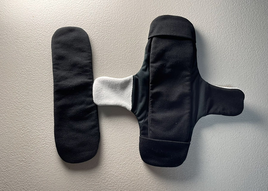 羽付きナプキンは、生地同士がグリップする特殊な生地を使用。 (従来のナプキンでは硬いプラスティックボタンやショーツの生地を痛めやすいマジックテープ)